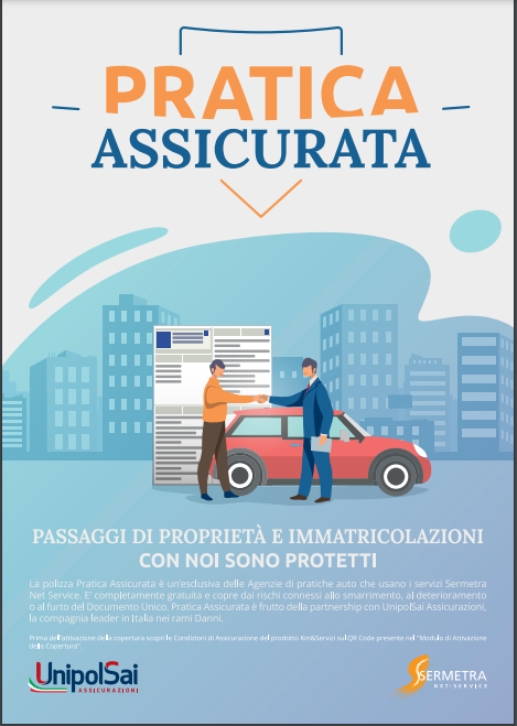 Grazie a una partnership con la primaria compagnia UnipolSai Assicurazioni, chi svolge una pratica di passaggio di proprietà o di immatricolazione presso la nostra agenzia, viene protetto da una copertura assicurativa.